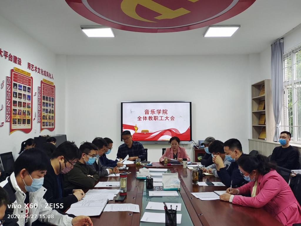 4月27日,音乐学院在艺术楼206召开全体教职工大会,总结开学以来的各项工作,安排学院近期开展的重点工作,会议由院长魏安石主持。
