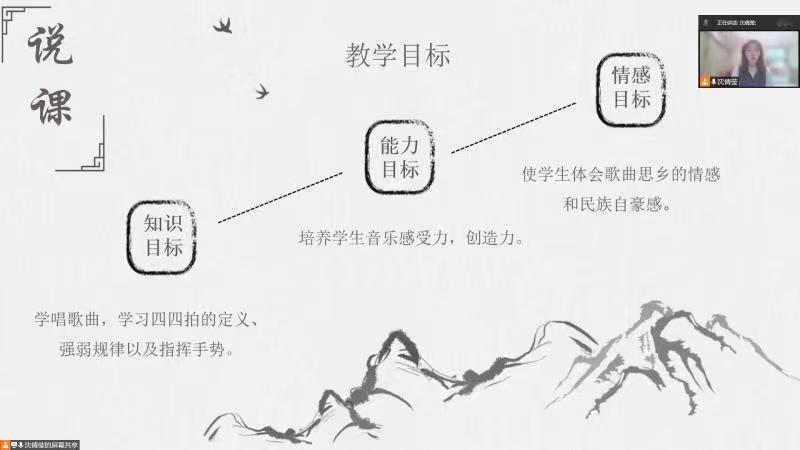 第一次活动于5月19日20:00,由我院20级音乐学专业学生沈倩莹在腾讯会议(会议号:236 840 895)开展师范生讲课技能展示,讲课题目为:唱歌课《静夜思》,授课内容选自人教版音乐五年级下册。