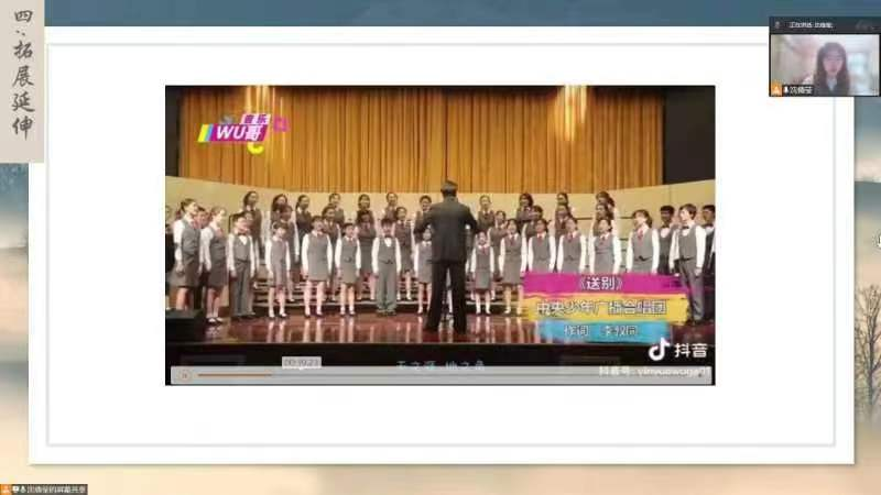 此次教学活动授课形式为线上课堂,由我院青年教师严洪萍老师指导。经过学生的精心准备,在课堂上,该同学以央视中国古诗词大会中康震老师现场作画、选手猜古诗这一环节的视频为切入点,以图片作为课程的导入手段,极大的激发了学生的学习兴趣,授课过程中主要学唱了古诗词歌曲《静夜思》,还带领学生学习相关乐理知识,最后的“选诗填曲”环节更是拓展了学生的音乐认知和文化认同。该学生教学目标明确,教学手段丰富多样,重难点突出,教学环节井井有条。