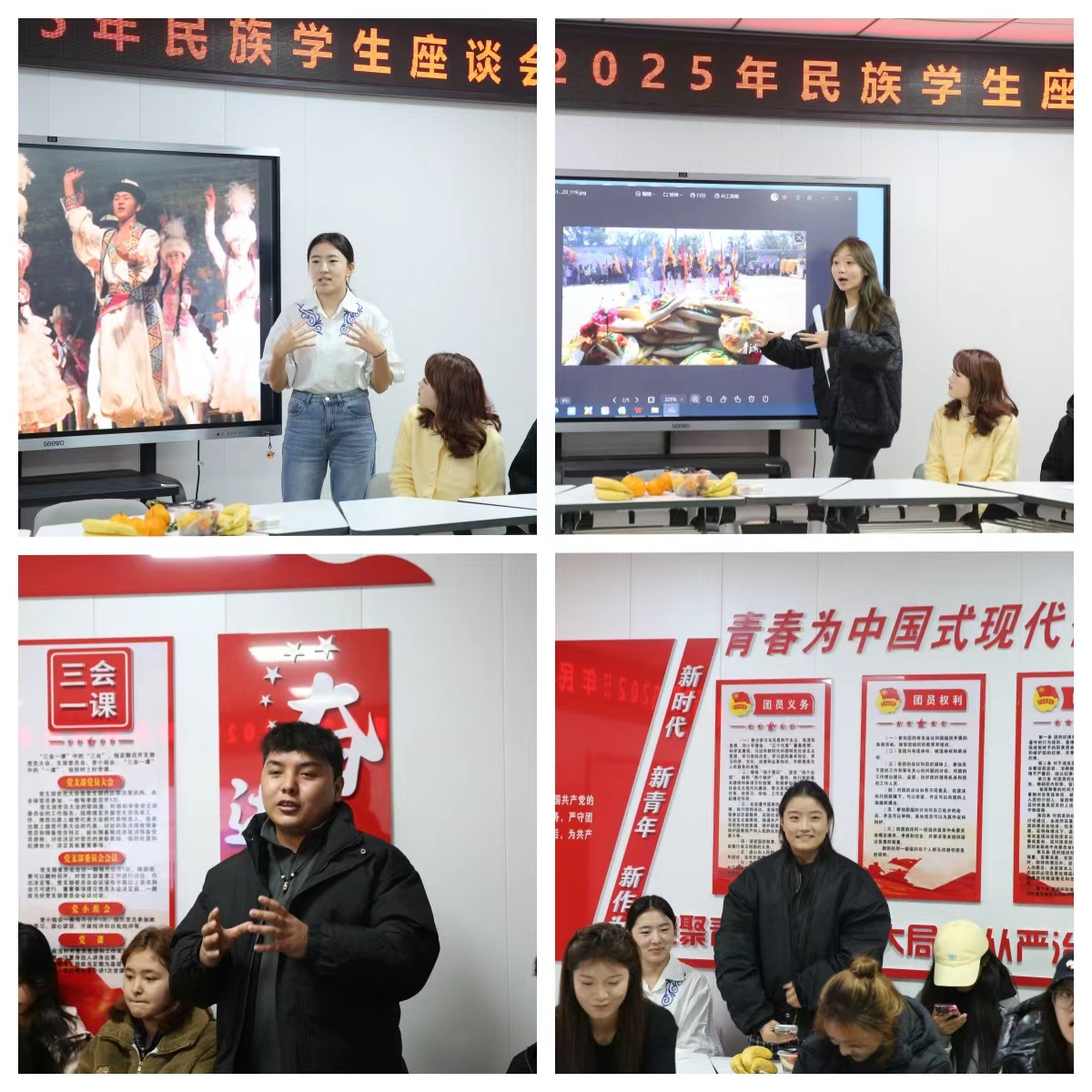 会上,参会人员共同学习了相关民族政策,进一步深化了对民族团结重要意义的认识。民族学生代表依次进行自我介绍,分享民族文化特色。2022级潘秋婉、2025级王辛洁、2025级古丽孜热·买买提哈孜生动讲述了水族传统习俗、土族文化传承以及柯尔克孜族艺术特色,让在场师生深切感受到民族文化的独特魅力与深厚底蕴。学生代表围绕专业学习发展、民族文化融合、校园生活适应等话题分享收获感悟,也提出了意见建议。同学们就校园服务保障、学业帮扶支持等问题积极提问,相关部门负责人逐一耐心回应。
