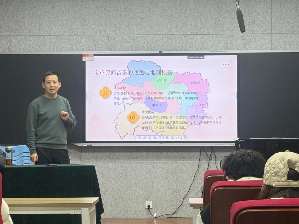 梁振中教授围绕“宝鸡民间音乐的底色、民歌与民间器乐、刻在骨子里的宝鸡印记、跟着地理读音乐、声音遗产的当代价值”5个方面,系统阐述了宝鸡民间音乐的地域特色、重要类别、声音气质与灵魂及当代价值,并倡议广大师生以倾听为起点、以再创造为路径,推动宝鸡民间音乐更好地传承发展。