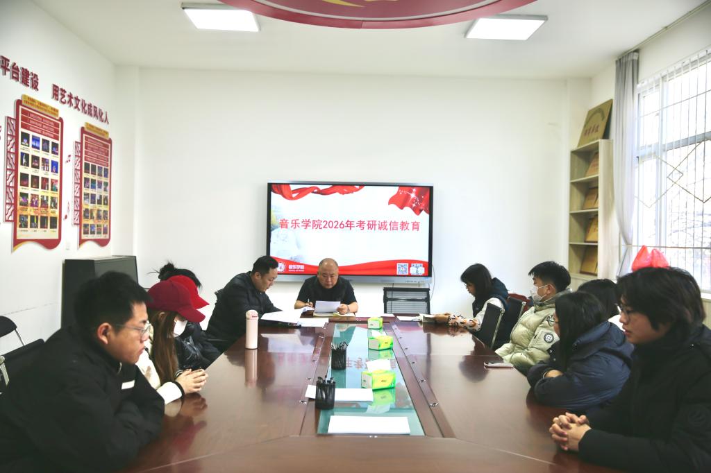 为进一步强化考研学生的诚信应试意识,明确考试纪律要求,助力学子以良好状态迎战2026年研究生入学考试,12月18日上午,音乐学院在艺术楼206举行2026年考研诚信教育,音乐学院副院长吕博、2022级辅导员蔡彦丽、全体考研学生参加了此次会议,会议由学院党委副书记、副院长樊振宇主持。