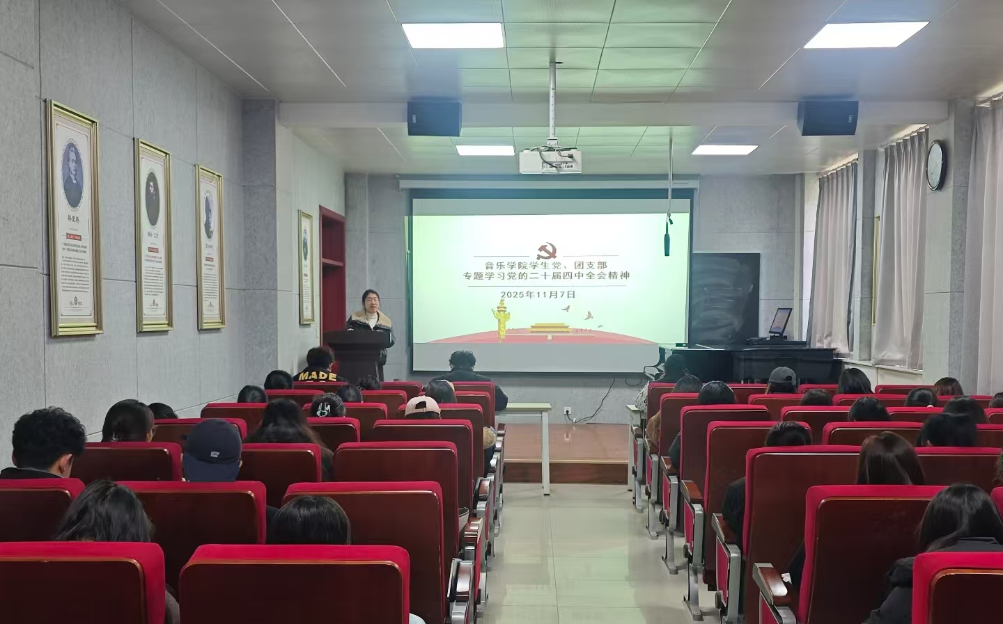 为深入学习贯彻党的二十届四中全会精神,精准把握"十五五"时期发展战略部署,11月7日下午,音乐学院在艺术楼202会议室召开音乐学院学生党员及团学组织学习会。会议由学生党支部书记王东东主持,全体学生党员、团员代表及主要学生干部参加本次会议。